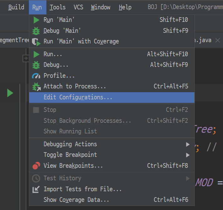 1. 상단 메뉴 -> Run -> Edit Configurations...